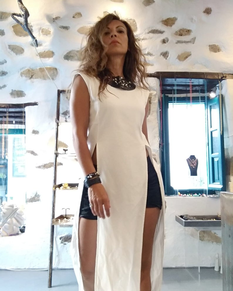 Long blouse in piquet cotton fabric/ with leather -rattan part that is removable (magnets hold)